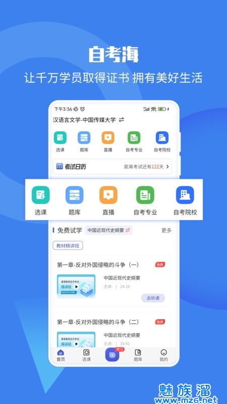 自考海题库免费版(com.examw.main.zikaohai)是一款十分优质好用的自考刷题必备软件,超多不同类型不同科目的学习资源汇聚其中,在这里轻松参与更真实的模拟测试过程,随时上线随时掌握更全面的重要知识点汇总。在自考海题库app中任意选择各种视频直播课、真题测试、精品课程等,学习刷题更便捷。