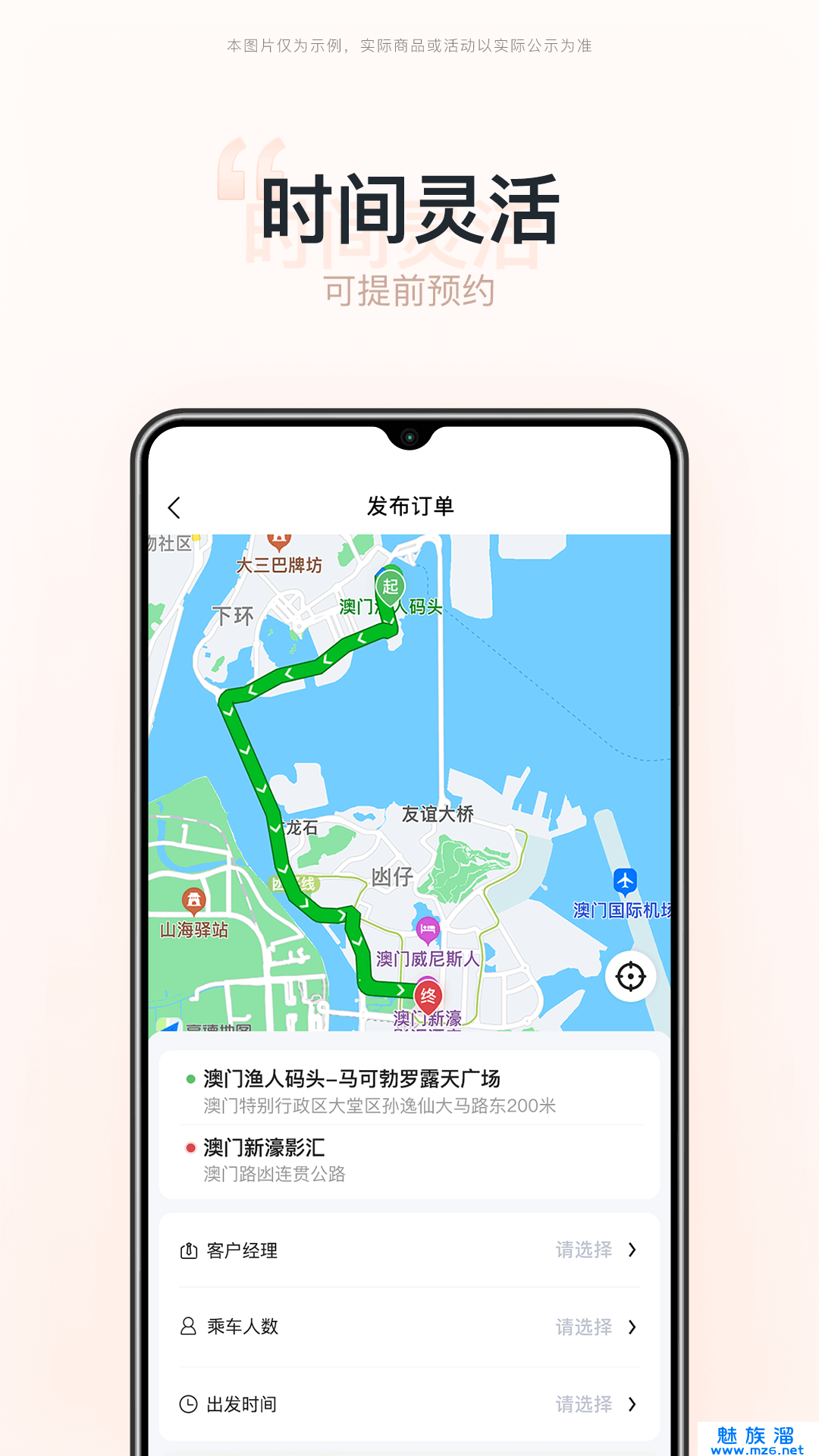 支持线上预约车辆服务,输入目的地和上车时间,即可获取。