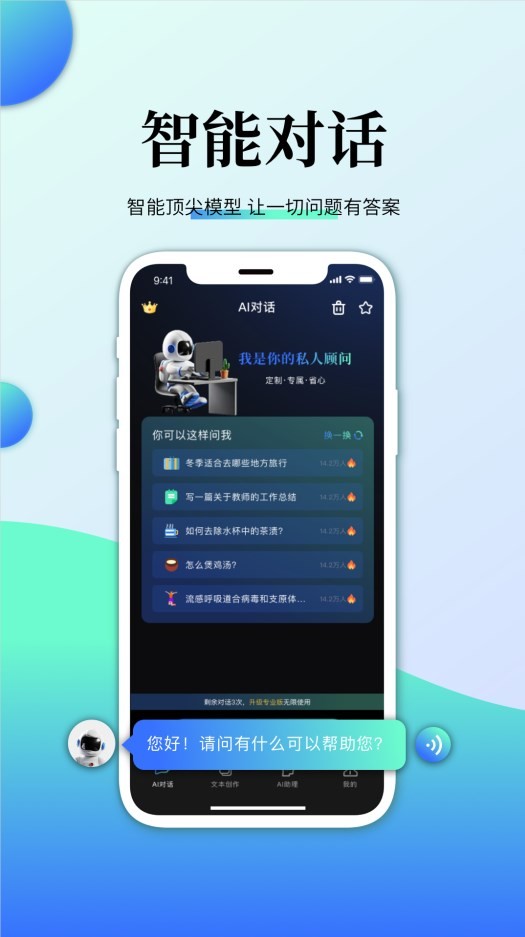3、用户可以去进行智能对话,你的所有问题都可以快速的得到回复,根据素材来给你灵感。