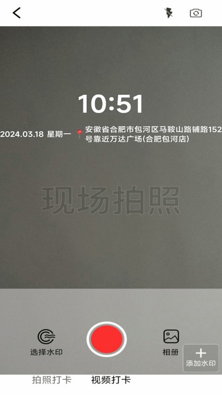 超轻松的体验,手机实时拍照,一键添加时间和位置水印,完成打卡;
