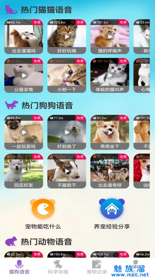 啵啵猫狗语音软件是一款专为众多养宠人士打造的智能翻译神器,有了这款软件实时了解自家宠物的表达意思,里面汇集了宠物训练技巧、不同的翻译模式、科学养宠物建议、宠物日常记录等内容。在啵啵猫狗语音免费版中操作简单又实用,所有的功能都是免费为用户提供的,帮助养宠人士与宠物互动交流,加深感情哦!