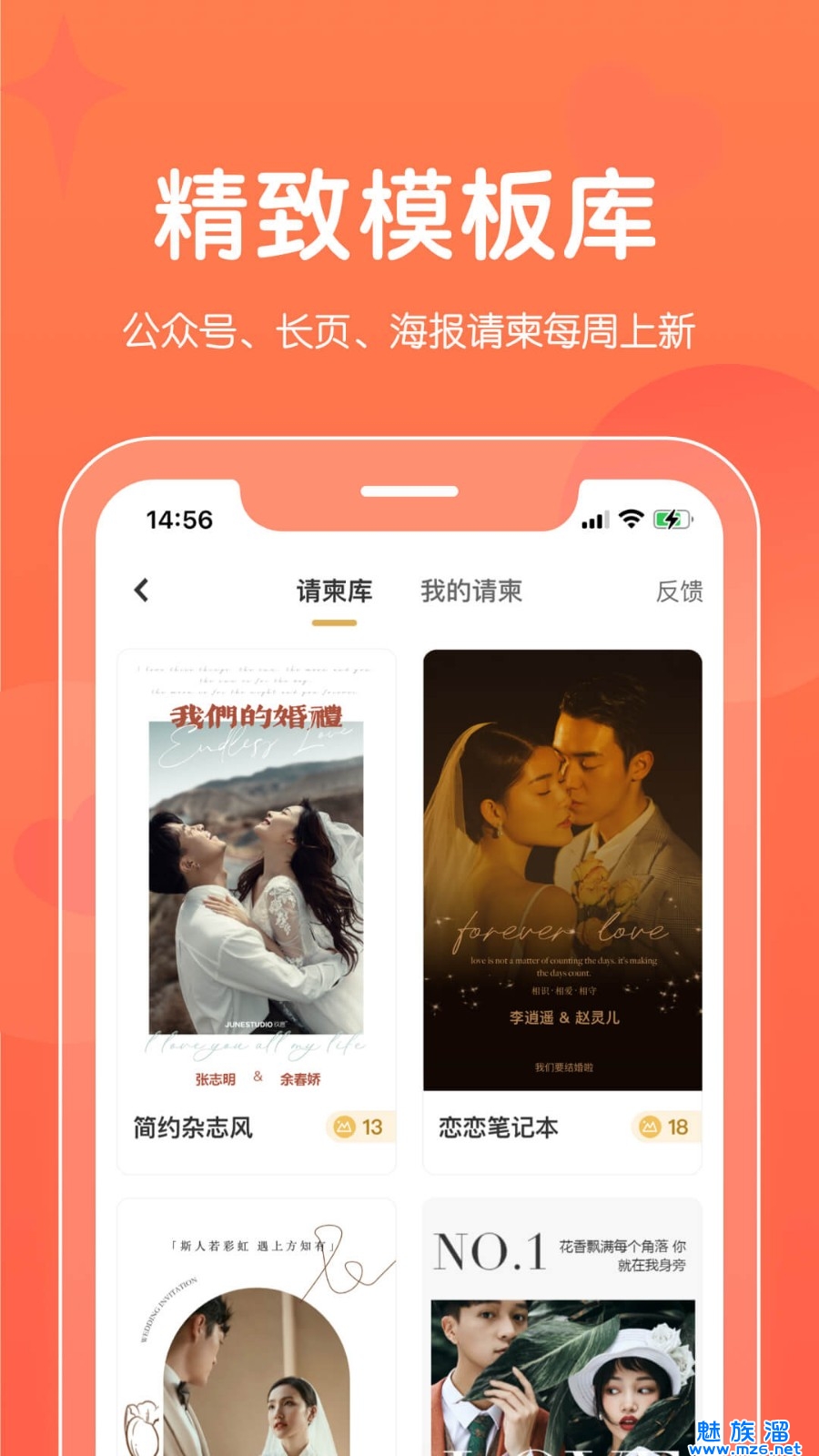 1、告别同质化,支持编辑文字、添加单页,做你的专属请帖。