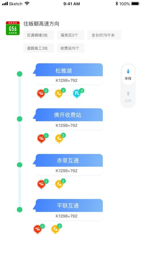 默认展示当前位置范围内一定范围内所有站口及高速路况,可选择的查看全省各路段站口及路况信息。