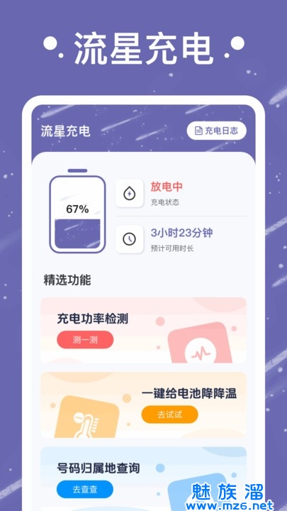 流星充电软件是款十分不错的电池优化管理平台,有了这款软件可以直接预约充电时间,享受更加丰富的充电模式,并且还能实时上线查询电池剩余电量,同时还能轻松的进行电池检测,让你了解电池的详情信息。通过流星充电安卓版中还能更好的维护电池运行安全状态,有效延长电池的使用时长哦!