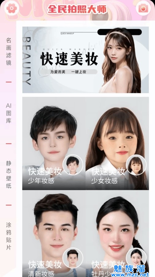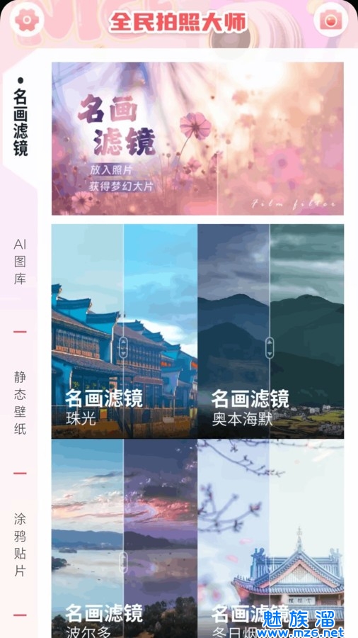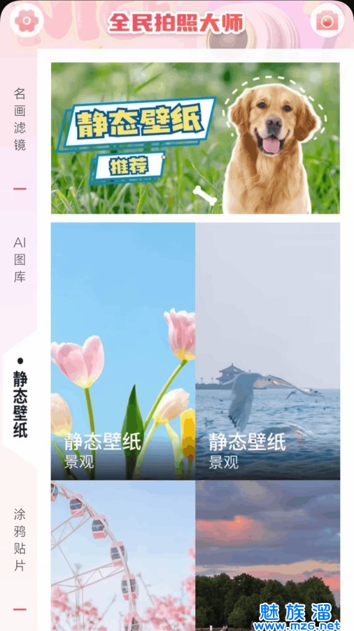全民拍照大师软件是一款十分好用的美颜拍摄手机软件,在这款软件中一键拍出喜欢的照片风格,各种唯美高清的艺术滤镜、复古特效、贴纸画框等素材资源任你添加,分分钟拍摄满意的美照。在全民拍照大师最新版本中还能自定义设置感兴趣的壁纸资源,不仅智能修图,还能将创建的壁纸美图分享给好友哦!