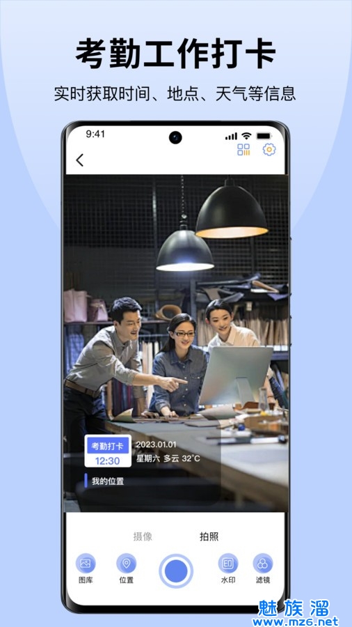 5、自动添加时间地点,考勤打卡、工作记录专属模板、自定义水印内容、编辑工作内容等。