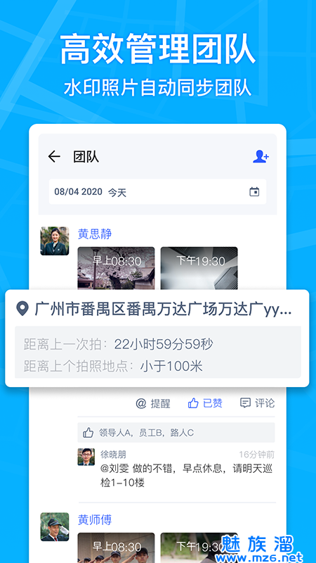 【兼职】:工作拍照同步工作圈,电子围栏圈定工作范围,出圈预警。所有照片自动同步储存各个团队的空间,检查抽查很简单。