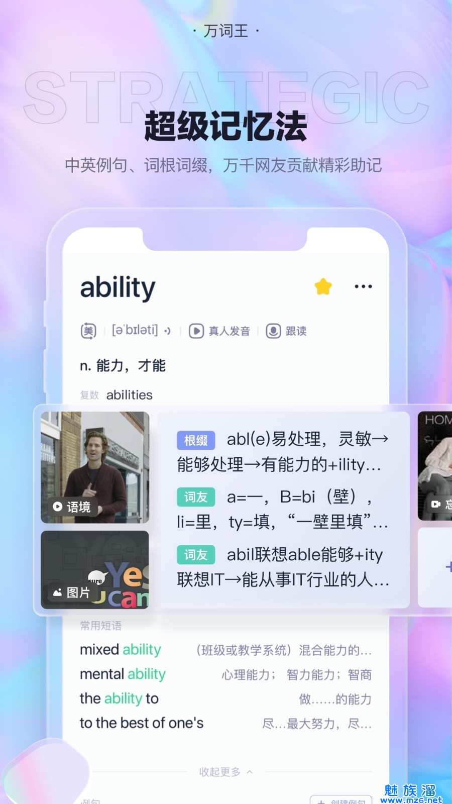 5、基于超级记忆原理,为单词提供正统、巧记、搞笑、笔记四种记忆模式。