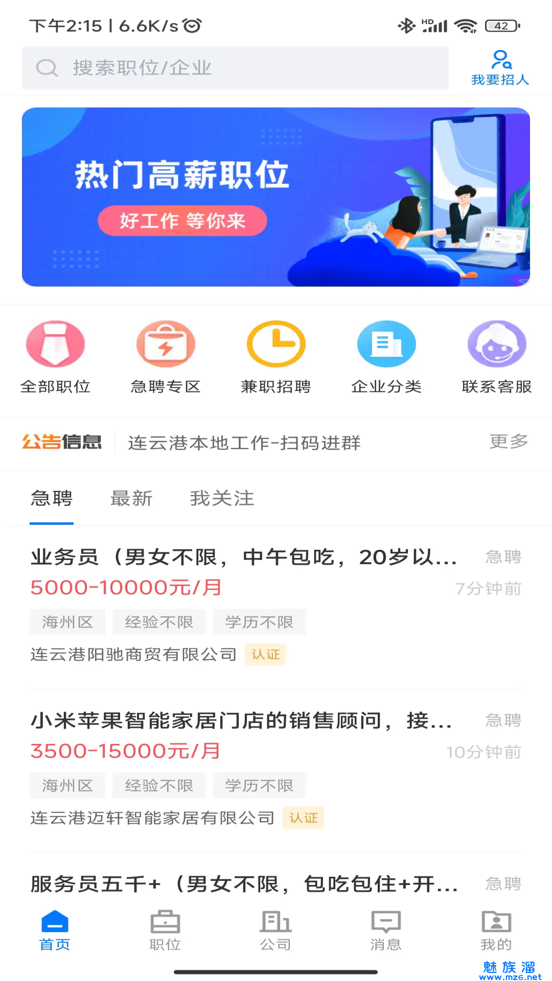 连联招聘网平台是一款十分正规好用的求职找工作软件,该软件主要专为连云港本地用户们打造的实用性帮手,随时上线随时查询最新最齐全的招聘情况,里面汇集了海量公司企业的招聘信息。在连联招聘网最新版本中可以根据兴趣词条智能匹配满意的工作岗位,有需要的用户快试试吧。