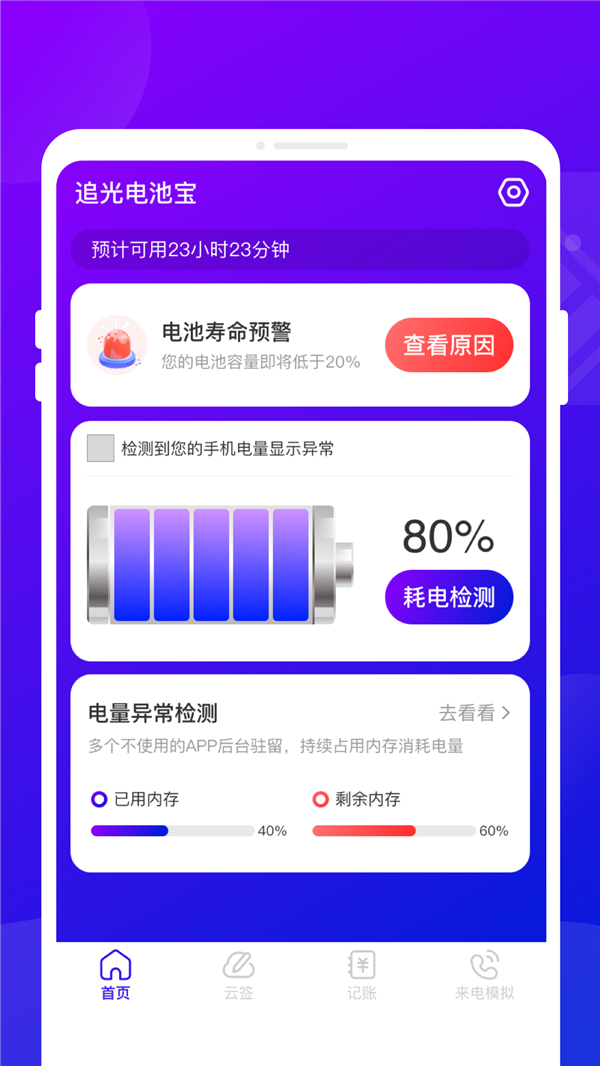 追光电池宝app官方版是一款超好用的电池优化类手机软件,专业的电词优化功能可以延长电池的使用寿命,一键开启充电功能优化可以保证电池的效果,超高性能的输出可以让用户体验满状态的手机,还有各种有趣的功能可以使用,感兴趣的小伙伴快来下载这款追光电池宝app官方版吧!