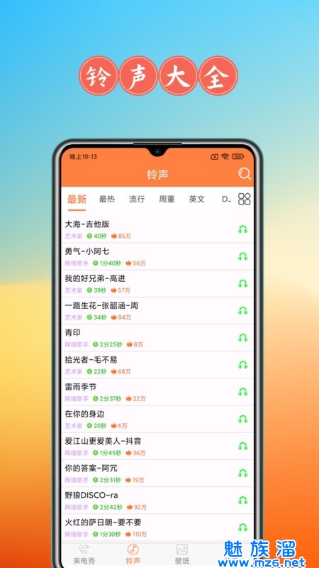6、把个性潮流的炫彩主题设置为来电秀,热门铃声,经典歌曲,任你更换。