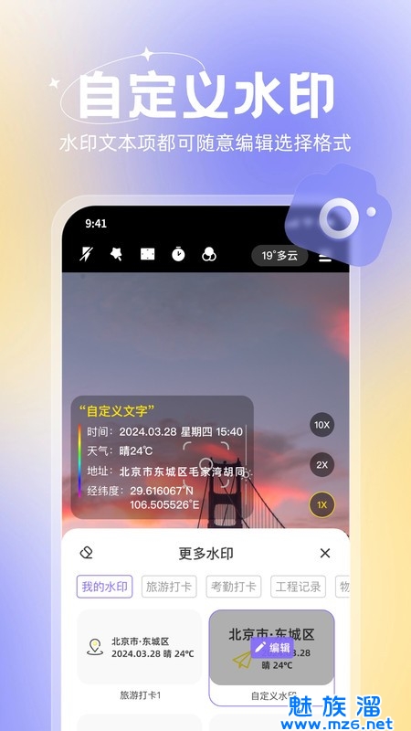 1、内置定位功能,可以自动记录拍摄地点和时间,方便你分享打卡轨迹哦。