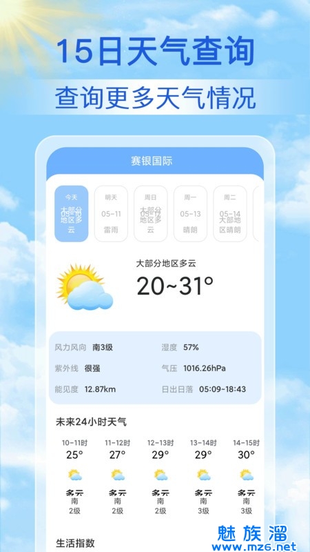 小编为广大居民用户们打造的天气预测查询软件,15日气象预报app。通过该软件实时查询更精准详细的天气动态,各种几点几分的天气变化一目了然,并且还能一键搜索未来十五天的天气预报情况。在15日气象预报最新官方版中为用户展示每日天气数据指标,让用户出行更安全无忧哦!
