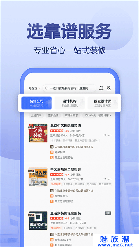 大数据科学算法,10秒轻松计算出装修预算,平台认证的在线设计师和本地装修公司提供免费专业的咨询服务,提升装修品质和空间利用,帮你装出理想家。
