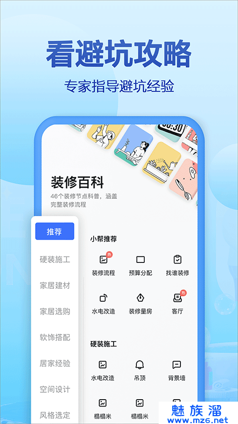 汇集了从装修前的准备工作,到拆除水电、泥瓦木工、厨卫施工、软装收纳等关键环节避坑经验,一站式找灵感、学知识,指导装修全流程。