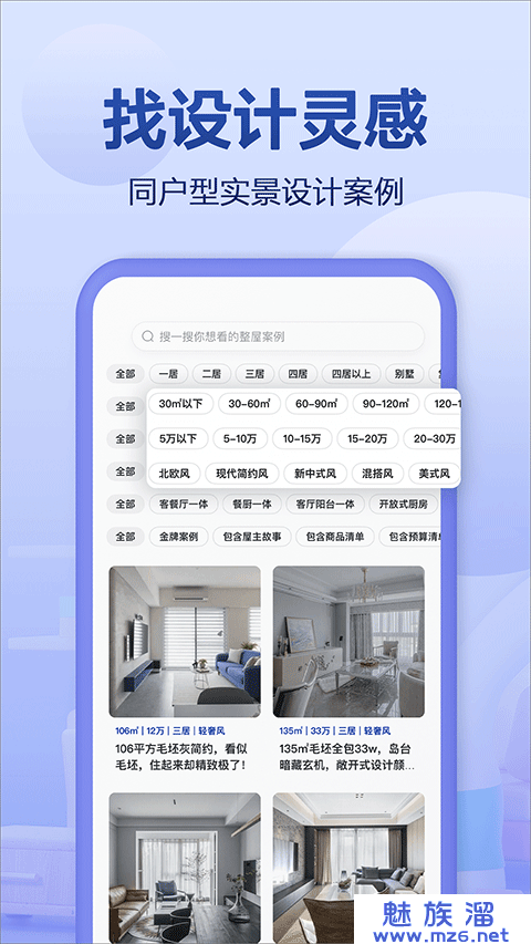 浏览千万屋主分享的真实装修案例和图集,按照面积、户型、预算、风格等条件,筛选出你想参考的理想装修设计,参考真实可靠的装修预算清单,快速找到适合自己的装修风格。