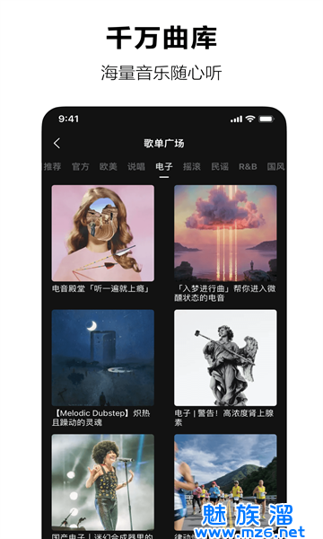 收录盛行/嘻哈/电音/摇滚/国风/民谣/独立/纯音乐/R&B/爵士/村庄/蓝调/雷鬼/拉丁等音乐品类,好歌听不完。