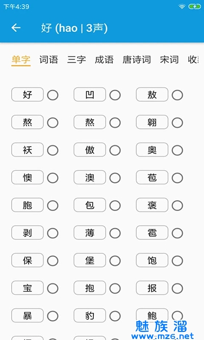 5、所检索的内容支持单字、词语、三字、成语、唐诗词、宋词等多项分类。