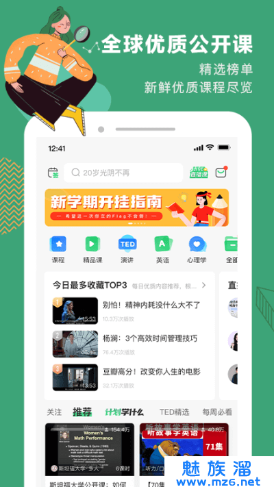 支持视频免费离线下载,等车等人、上学下班、书房卧室、想什么时候看都随你。根据每个人的学习行为,向用户提供个性化内容推荐,帮你毫不费力地找到最感兴趣的知识点。通过课程跟帖与万千"同学"交流心得、争论观点。