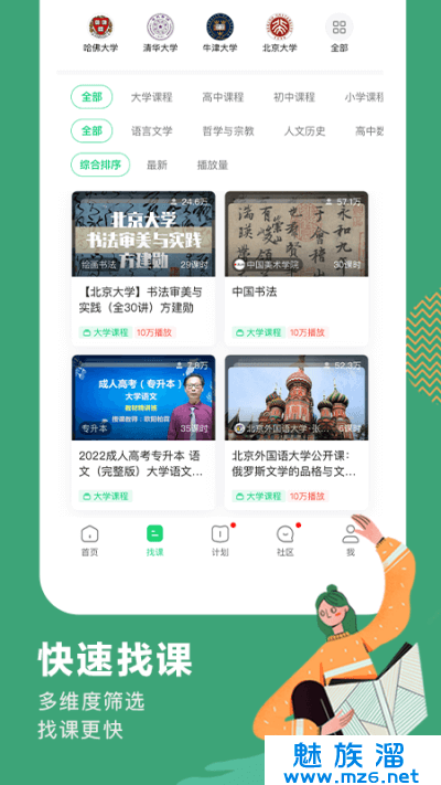 最全的课程和最快的中文翻译! 两千多套优质课程,涵盖人文、哲学、数学、心理学、经济学等领域。