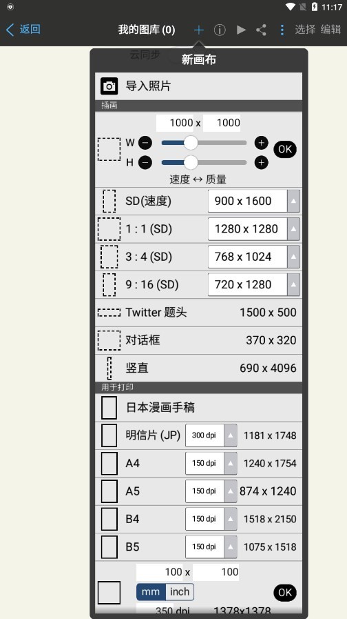 2.打开手机上的爱笔思画X官方版软件,点击“我的图库”选项,接着会弹出新建画布的窗口,这里可以选择软件自带的画布尺寸,也可以定义画布尺寸;