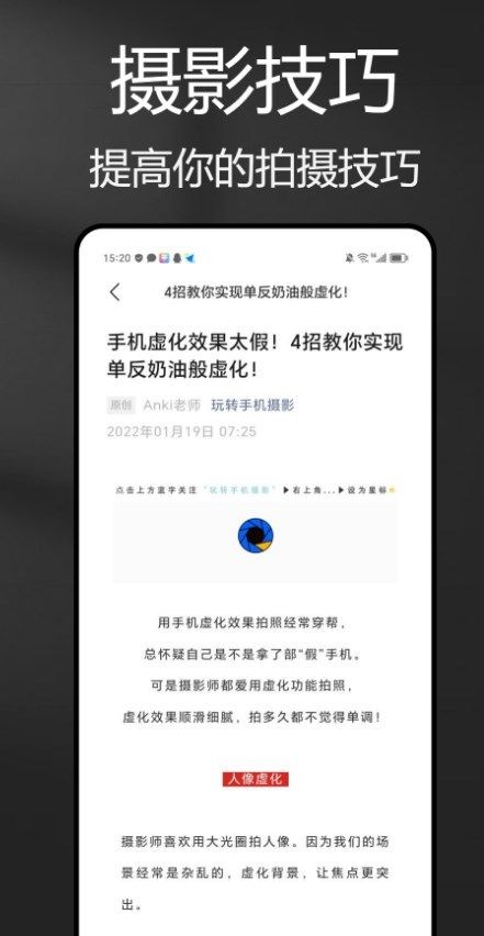 1、拍摄技巧:用户可以来这学习各种拍摄相关的技巧知识,可以打开你的拍摄思维。