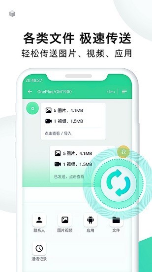60秒极速换机,轻松传输通讯录、通话记录、图片、 音乐、视频、应用、电子书、等手机数据,速度高于蓝牙一百倍。