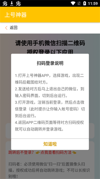4.返回上一个上号神器app的二维码页面,等待对方的扫描授权自动重定向登录
