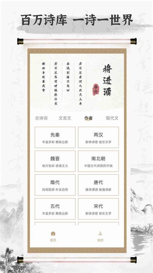 1、下载软件之后可以看见这样的界面,在这里有古诗词、文言文、作者、现代文等等。