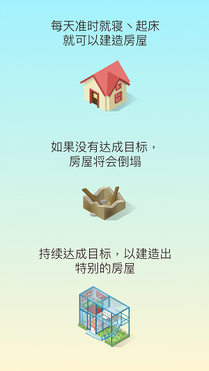 3、提供按时起床就可以建造房屋和收获金币的功能。