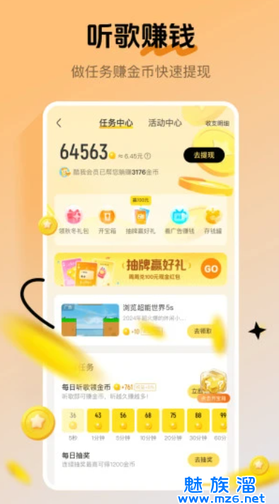 1、普通用户听歌赚钱:下载安装酷我音乐后,登录账号点击左上角的三个横杠,找到 “听歌赚钱”。从歌曲列表中选择歌曲,单曲播放超过 30 秒即可获得金币,连续听歌的天数越多,获得的金币数也就越多。金币每天会自动转化为现金,当现金达到 15 元时可通过微信提现。