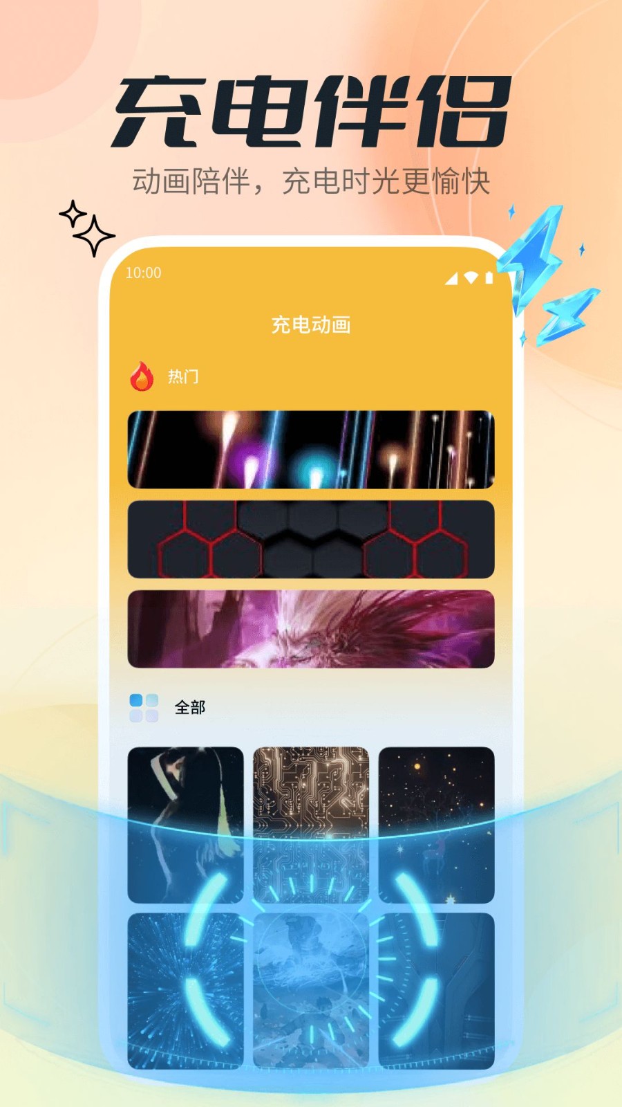 1、电力秀场,独特的手机充电动画,展示了充电的新风尚。