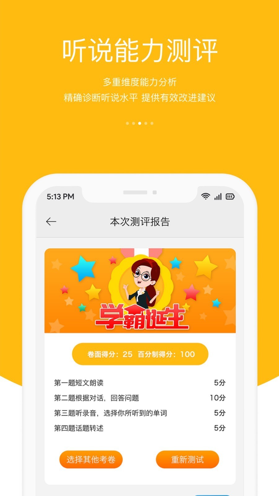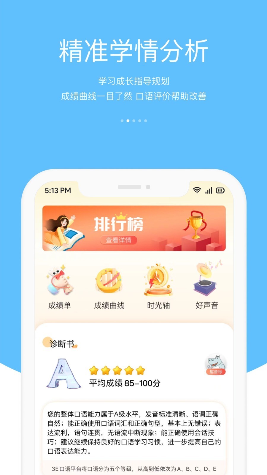 通过对学习数据的统计分析,及时为老师和学生提供准确的英语能力诊断书。