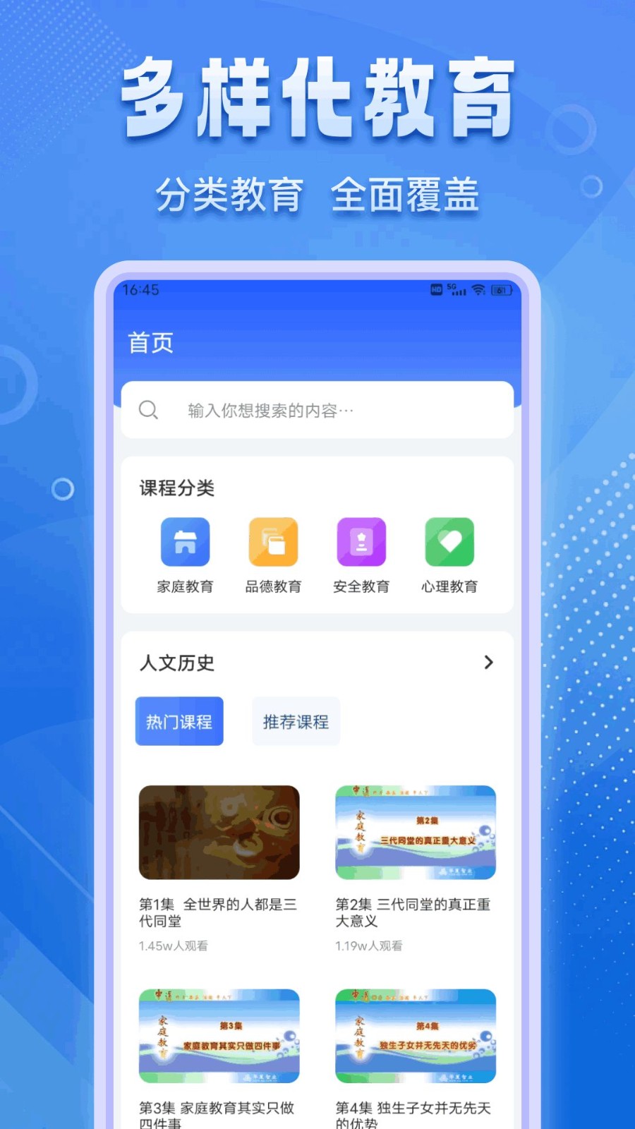 2、首页有课程分类,包括家庭教育、品德教育、心理教育、人文历史等。