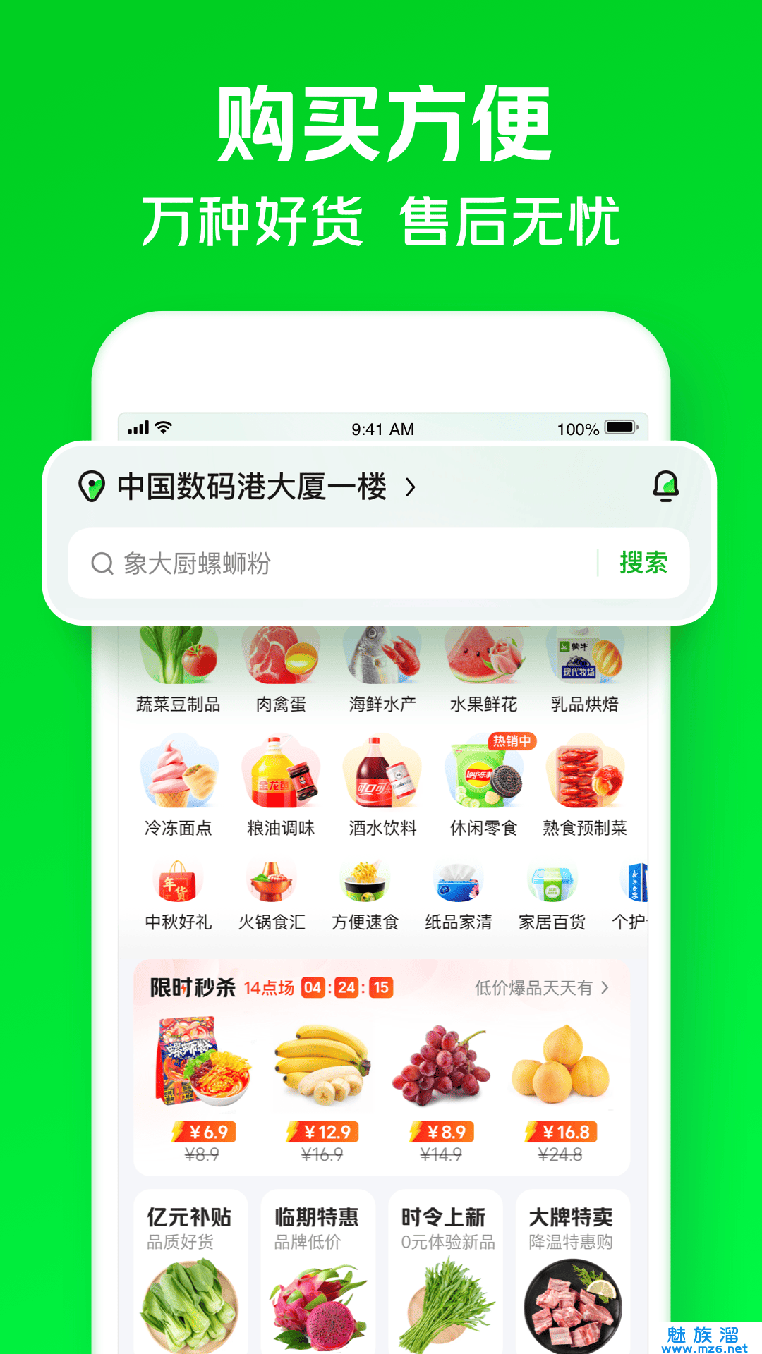 蔬菜水果、肉禽海鲜、酒水饮料、鲜花烘焙、熟食速食、休闲零食、厨房用品、日用百货、洗护清洁.......买啥有啥,买啥都快。