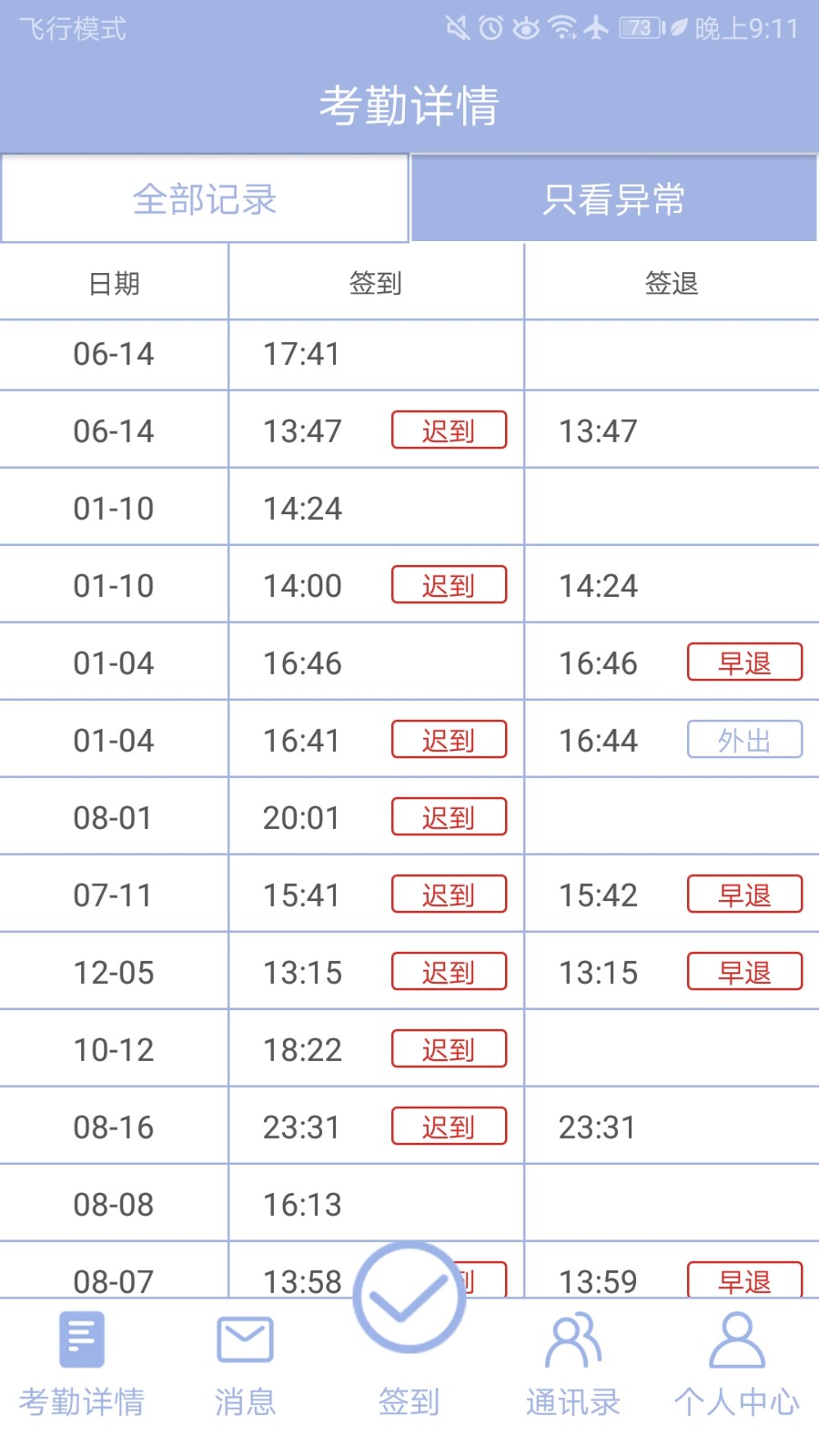 5、员工可以进入个人中心翻看签到记录,清晰的呈现时间和地点等信息。