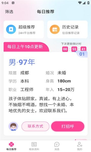 2、在优质推荐部分,展示了不同年份、地区、性别的单身人士信息,方便挑选。