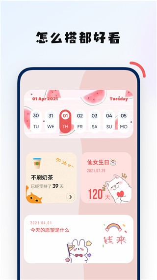 3、拥有超多不同类型的精美小组件:倒数日、桌面时钟、天气、日历、句子语录、日常打卡等好玩又好看的小组件,快来添加到手机桌面上!