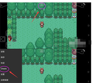 1、在手机上开打gba模拟器带金手指安卓版,运行游戏后,点击如下图标,选择 Cheats;