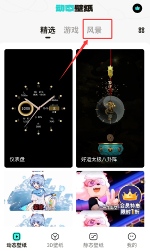 3、在动态壁纸页,点击风景分类标签。