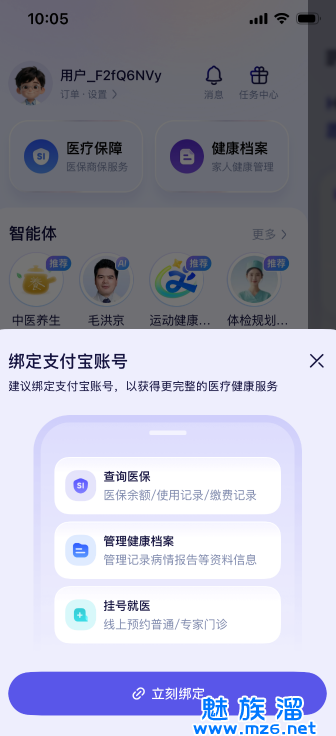 5、点击医疗保障,软件会关联支付宝账户,绑定用户的医保账号,方便后期在蚂蚁阿福上面直接挂号缴费。