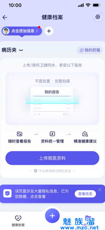 数据导入:部分地区可一键导入过往就诊与体检数据,支持 PDF、图片上传报告。