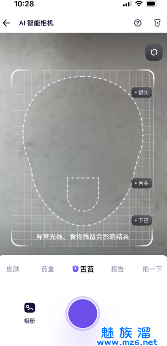 8、蚂蚁阿福app还有拍摄解答功能,用户在主界面点击相机图标,就能进入拍照模式,舌苔、皮肤、药盒、病例这些都可以拍照,上传照片后,会给用户进行专业性的回复。